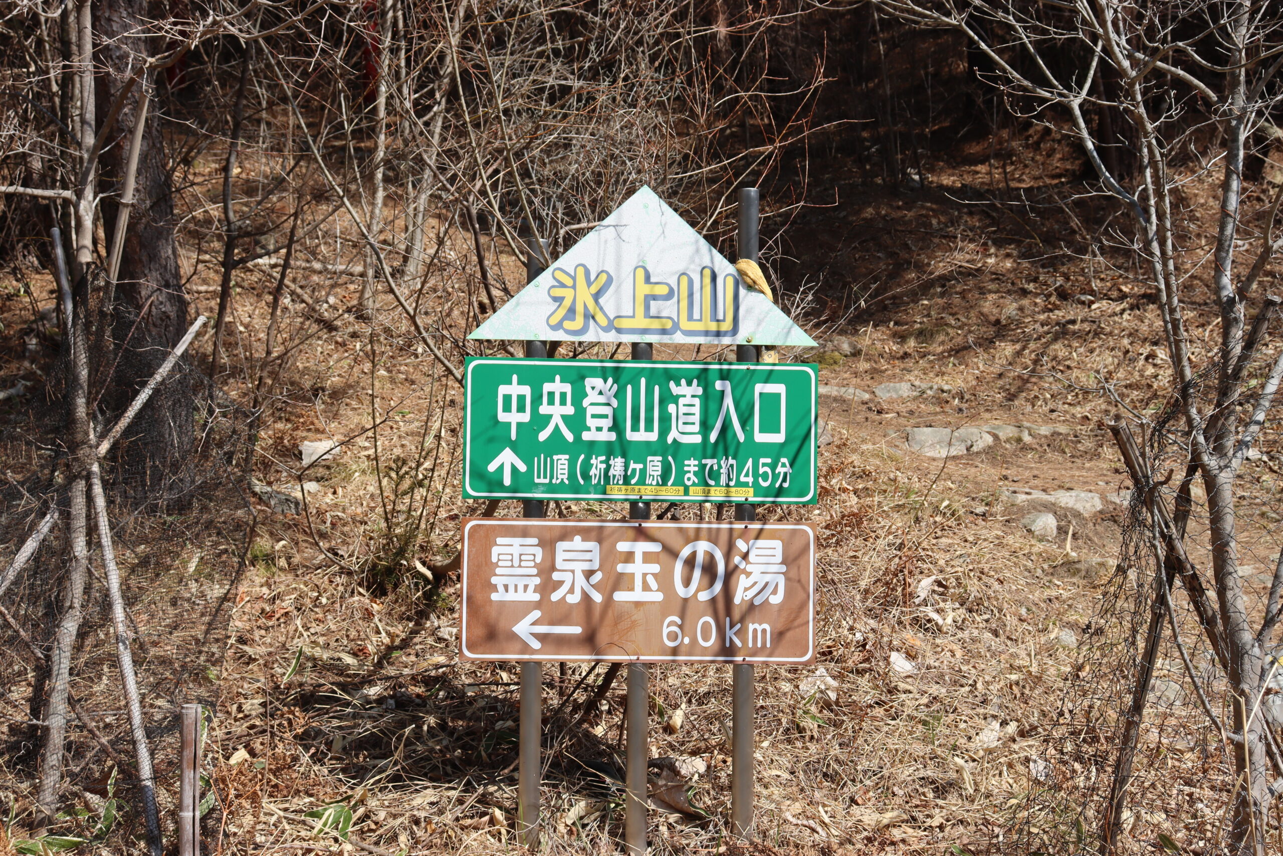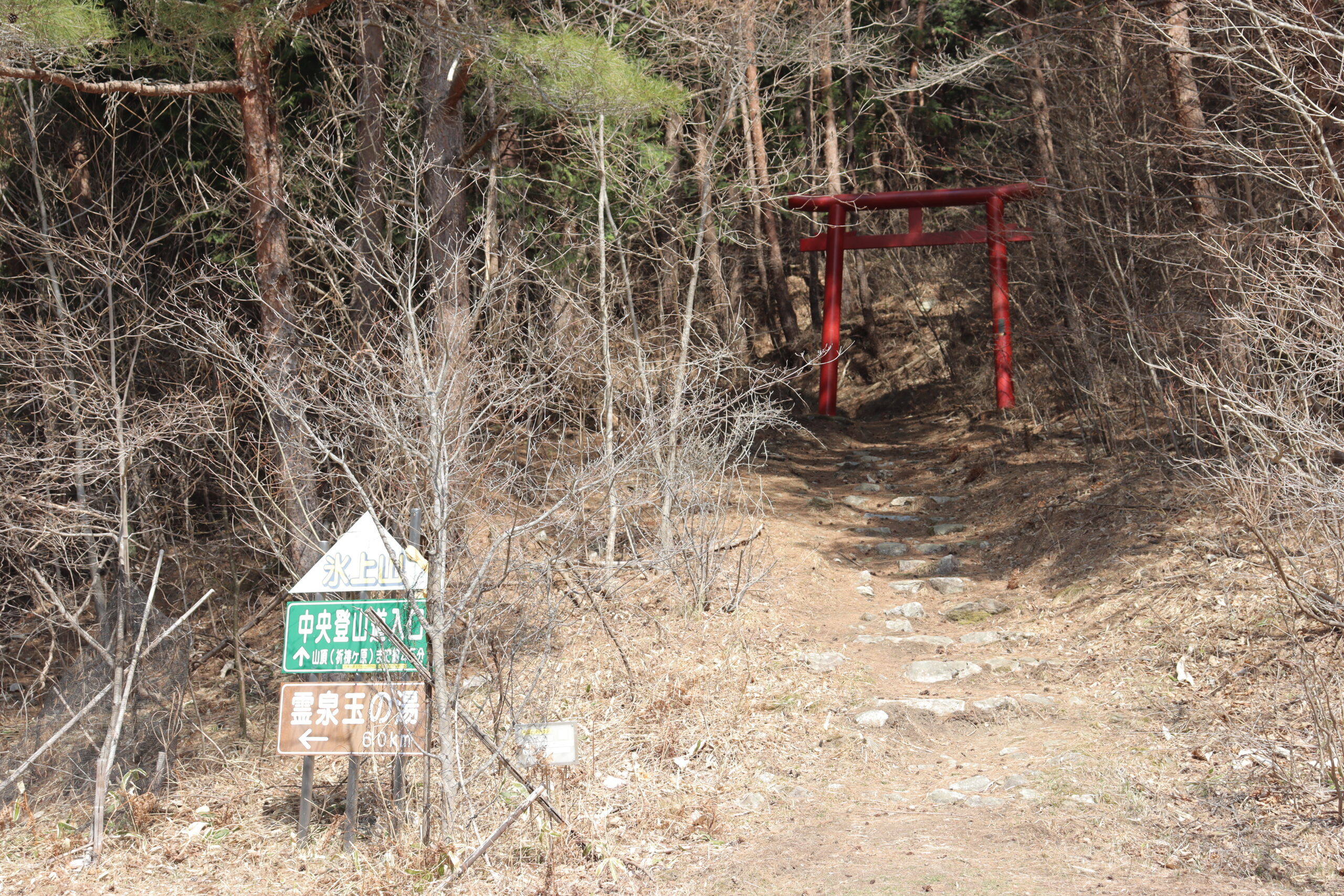 ※中央コース登山口は以下の看板、または赤い鳥居が目印です。