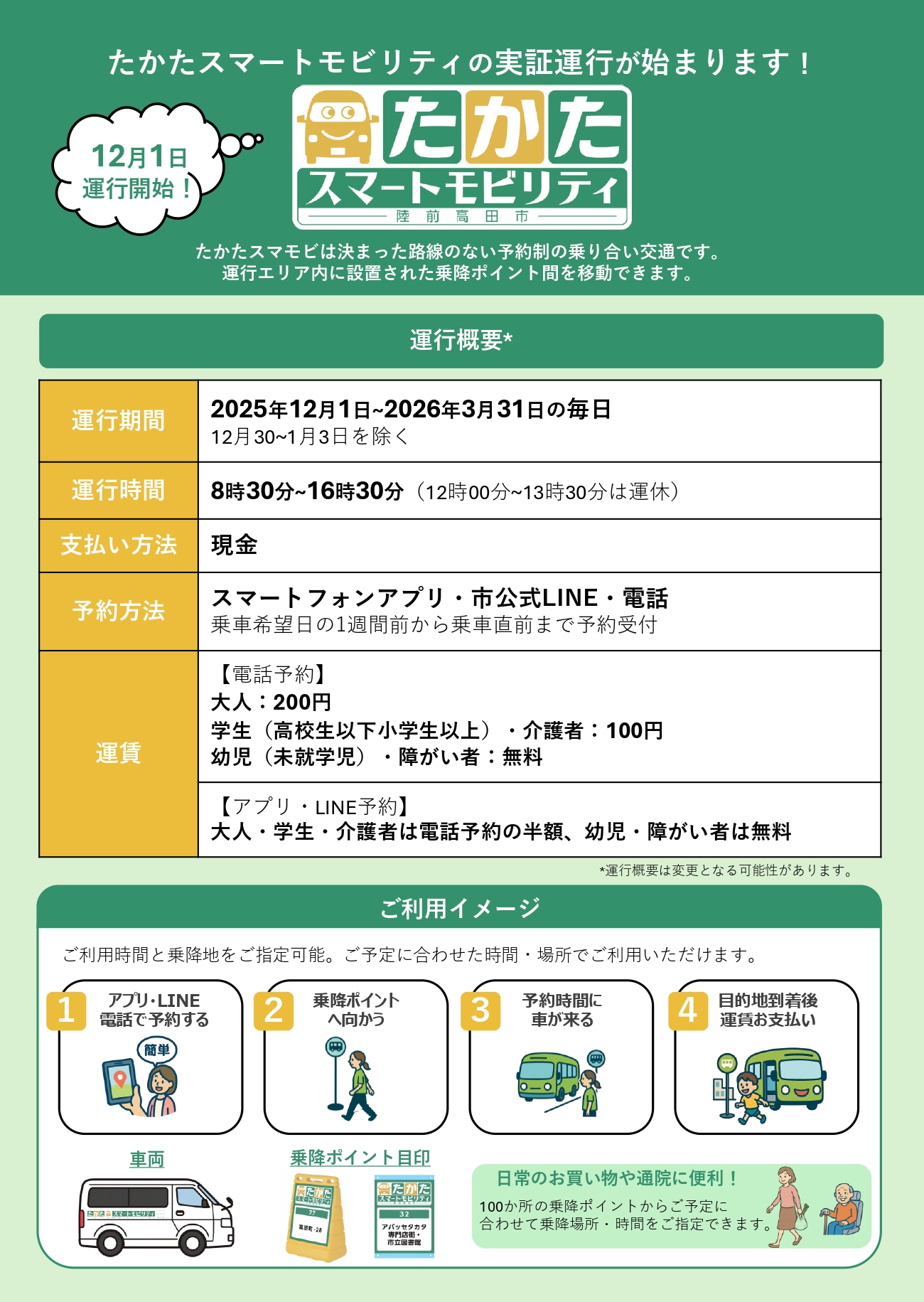 ・運  賃 大人:200円、学生・介護者:100円、幼児(未就学児)・障がい者:無料