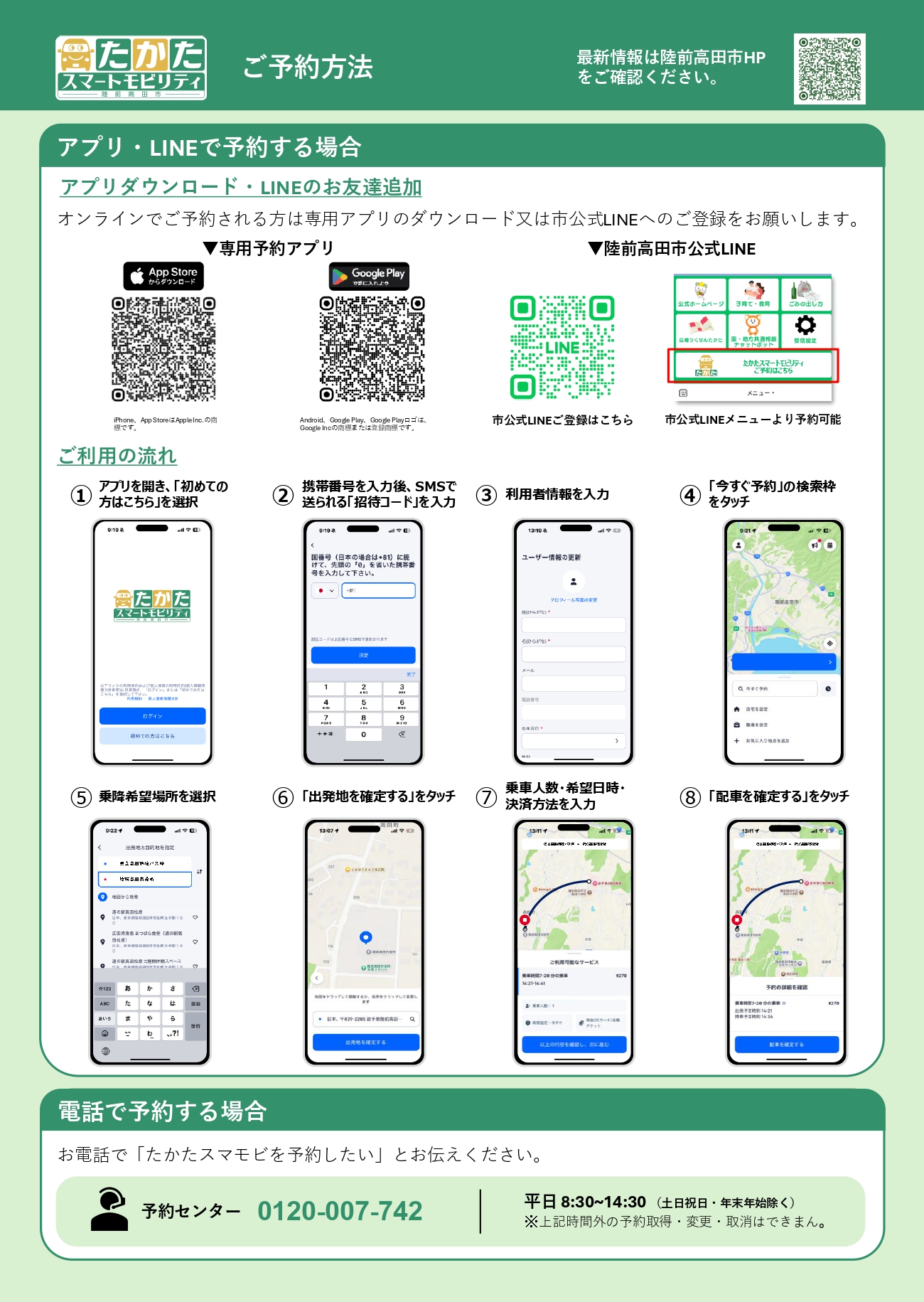 お持ちのスマートフォンのアプリ、市公式LINE、電話で予約を受け付けており、乗車直前でもOK!